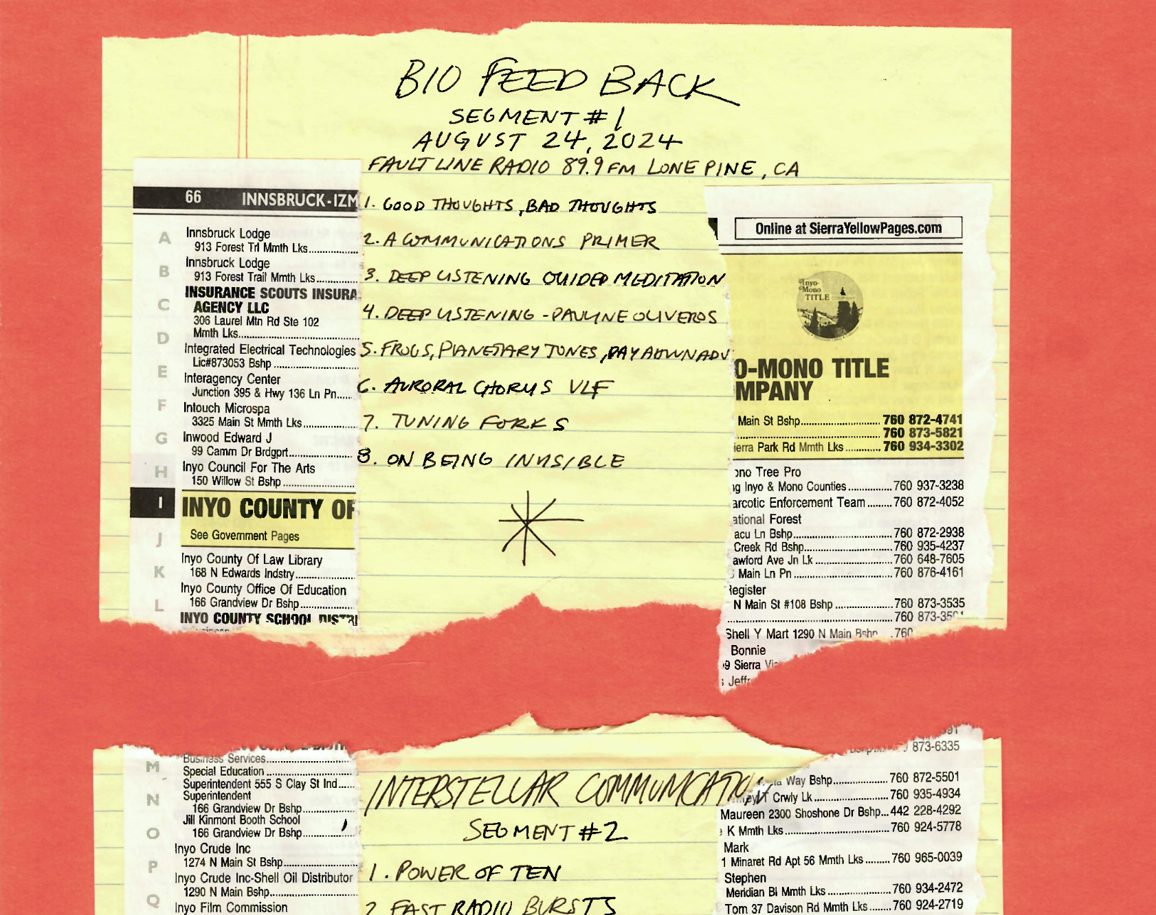 Fault Line Radio experiments with a range of transmission modes including terrestrial radio, satellite radio, livestream networks, and face-to-face conversation. Its broadcasts relay environmental, cultural, and historical/ahistorical narratives from within the Metabolic Studio archive, the Owens Valley, the Intermountain West and beyond. Tune into 89.9 fm when you see signs for Death Valley on Highway 395.